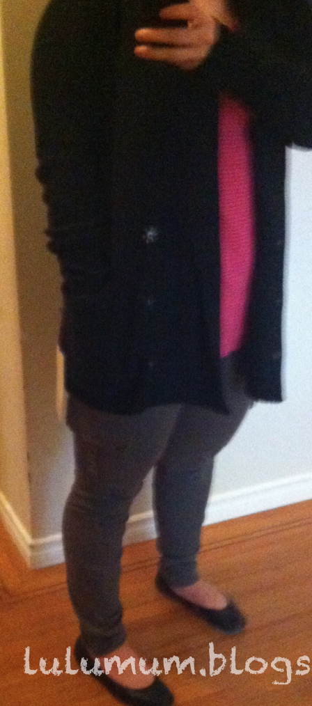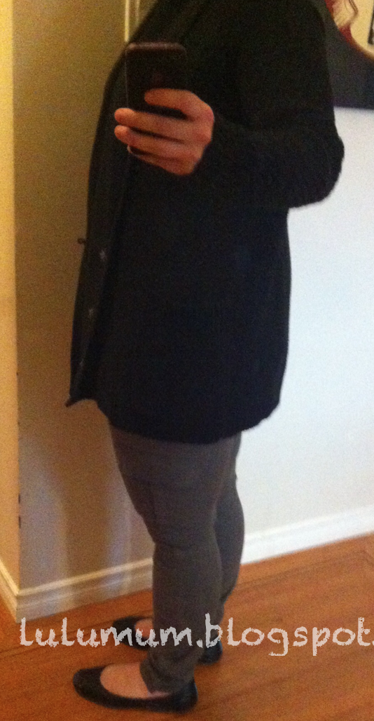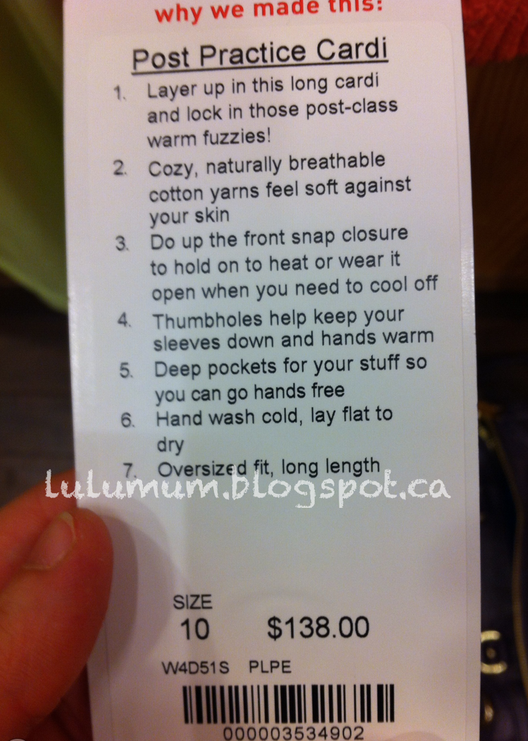 I decided to swing by my store today in off chance of seeing something new like the Zing Pink Power Y, but instead I saw this awesome new cardigan called the Post Practice Cardi. It comes in Black, and Orange (not sure which orange it was) and its priced at $138. I find the price steep considering the material of the cardigan is cotton and not the usual boolux cashmere blend. None the less, I loved the styling of it, loved how lightweight and airy it was and I came home with the black in a size down.  It just felt really stylish on and when I saw it on the educator wearing it really looked great on her. The fit is really loose and relaxed, but even sizing down you still get the butt covering length and the slouchy look and I just felt like the proportions of the size down was better for me. Size 8 comfortably fits over my Open Your Heart LS, even in the upper arms and armpits.