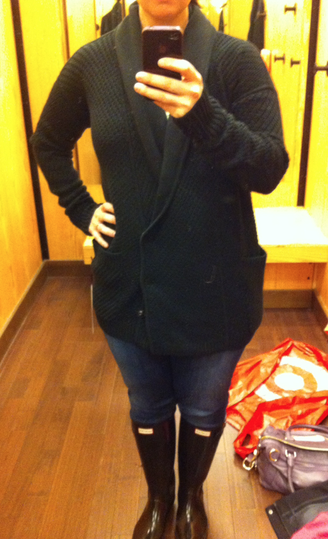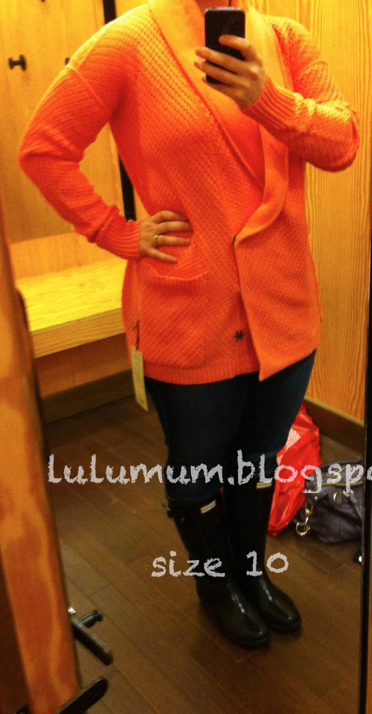 I really wavered between the orange and the black. The orange looked so great on but I worried about what I could wear underneath it since I prefer the look of this cardigan left open. Orange looked pretty with Clear Mint CRB, probably white, off whites, and other neutral subdued colors. Its really more of a peachy soft orange that reminds me of Persimmon from 2010. Black will have way more use in my closet though so thats what I opted for for now. I’m wondering if we will see this in an off white color, or grey as well.
