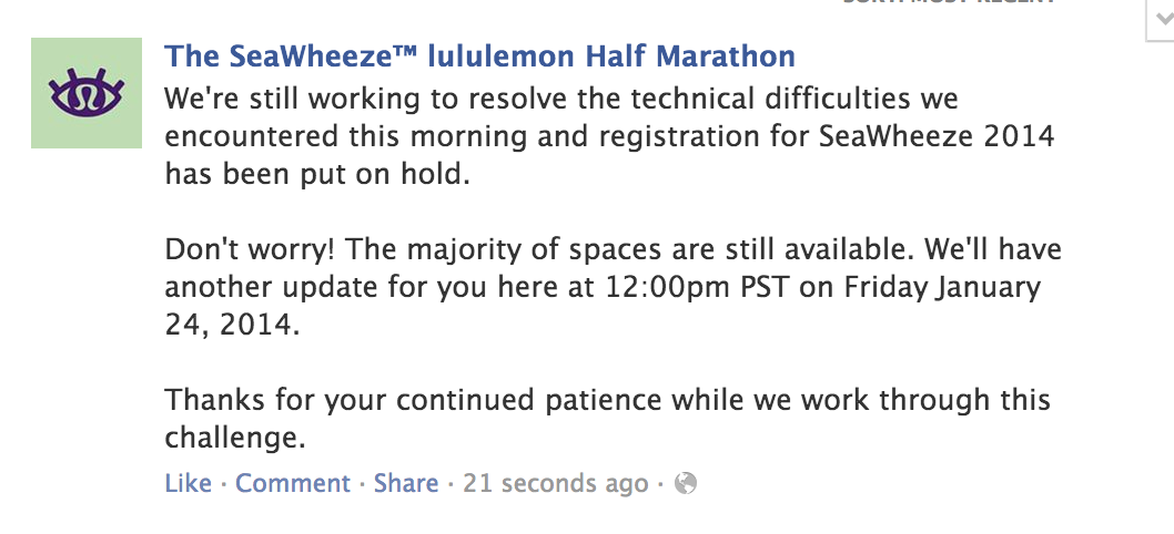 I have spent hours today trying to register for this race and then after 3 hours the update said registration would be closed until 3pm PST today so that they could resolve the technical issues. I took my laptop with me to school pickup and tethered the to my iphone WIFI and now the registration wont be until tomorrow at noon. What a frustrating experience this has been.