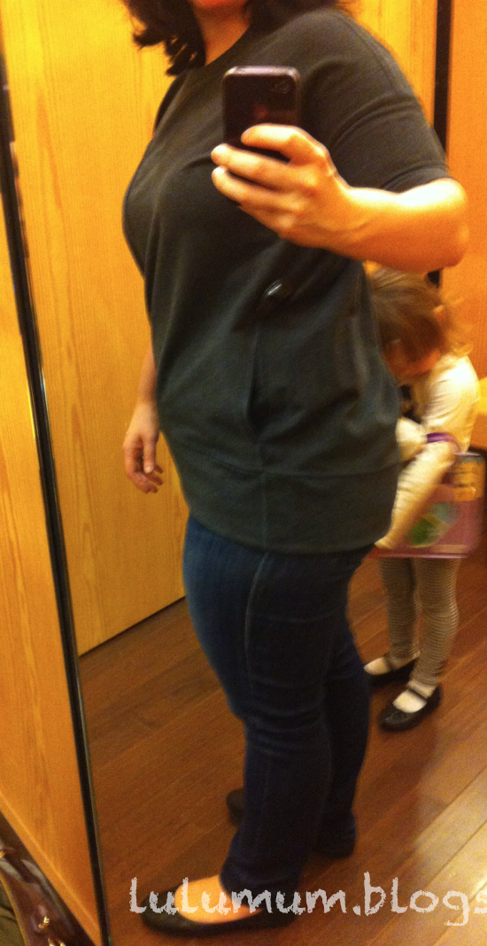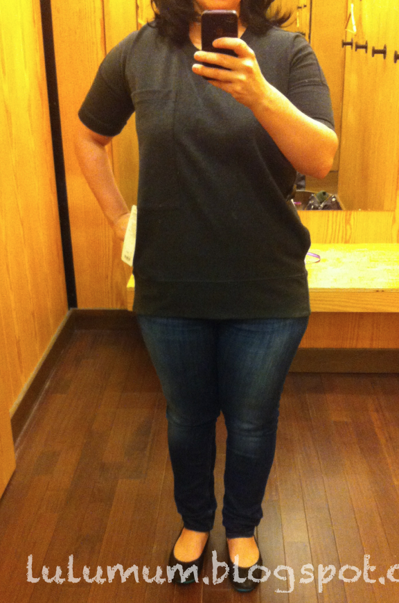 For fun, I tried on this weirdly designed Mudra SS Shirt. I was intrigued by the idea of a short sleeved pullover/hoodie and would have liked this had it been a thin cotton french terry with a nicer drape (like the Exhalation Pullover) instead of this heavier version which just hung and bunched and didn’t flow very nicely. Also, I wish it didn’t have that breast pocket and the really bunchy hip pockets.