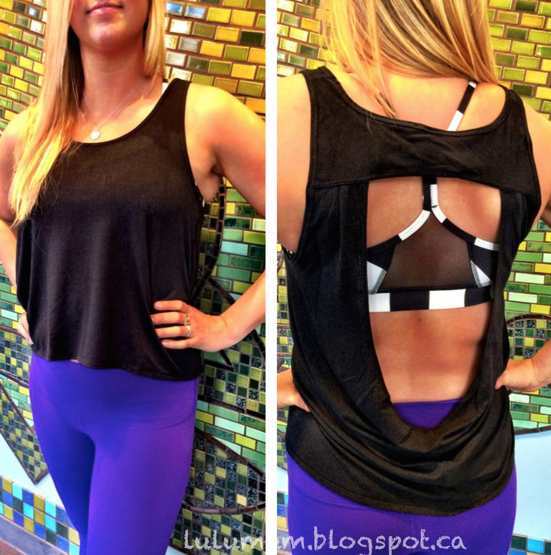 I believe this tee is called the Next To Nothing Tee, in Manifesto Burnout. Worn with the Bruised Berry Roll Down Wunder Under Crops
