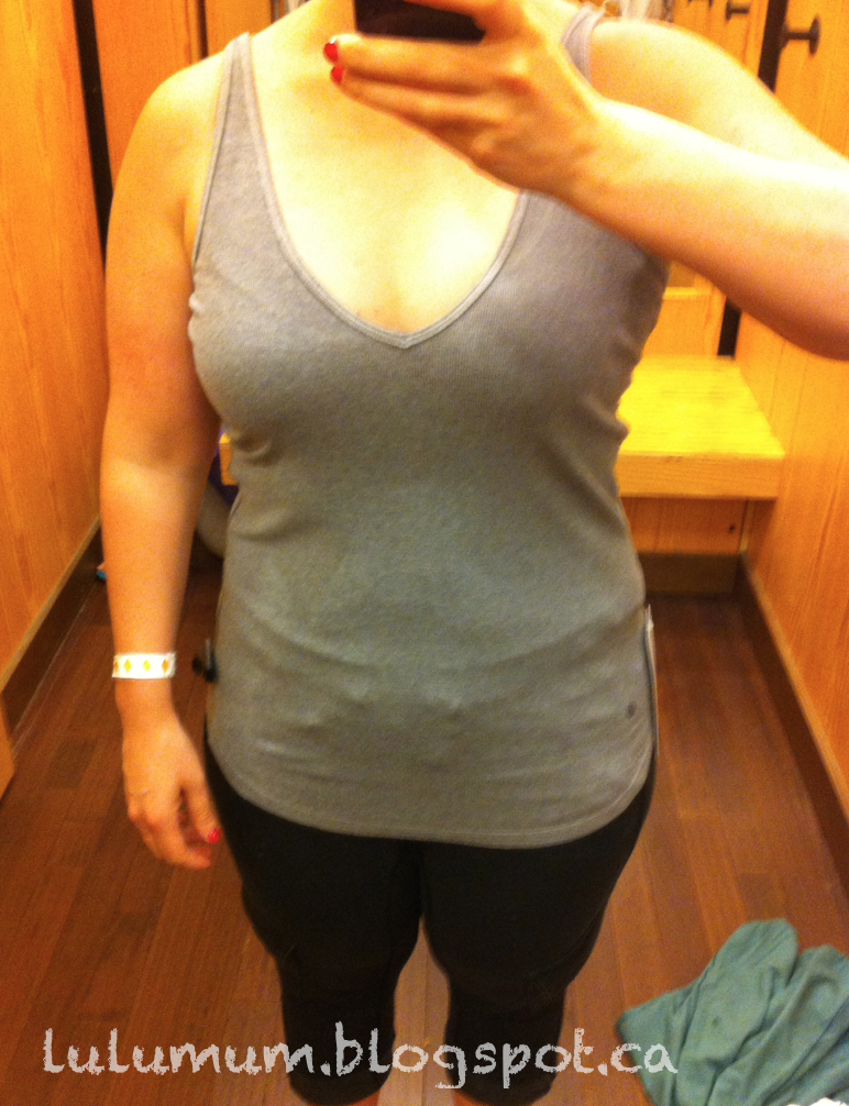 The Mudra Tank was a total winner for me. I was wearing a regular bra and it was fully covered with the V neck front or back despite how open the neckline and back feel.  I was worried that the straps are so wide set that they would slip down but it never did during the time I had it on in the fitting room. The material is a nice thick ribbed modal french terry and although it is somewhat thick it is very soft, breathable and it has a ton of give. Modal is a fabric that relaxes and stretches out quite a bit more than cotton does so if it feels a bit clingy at first, within 5 minutes it wont be. My one nit pick about it is that the embossed logo is on the v-neck side so if you choose to wear that side forward the logo will be on your right hip. Not a big deal at all. I got this in the grey but I would absolutely love it in Heathered Forest if that even exists.