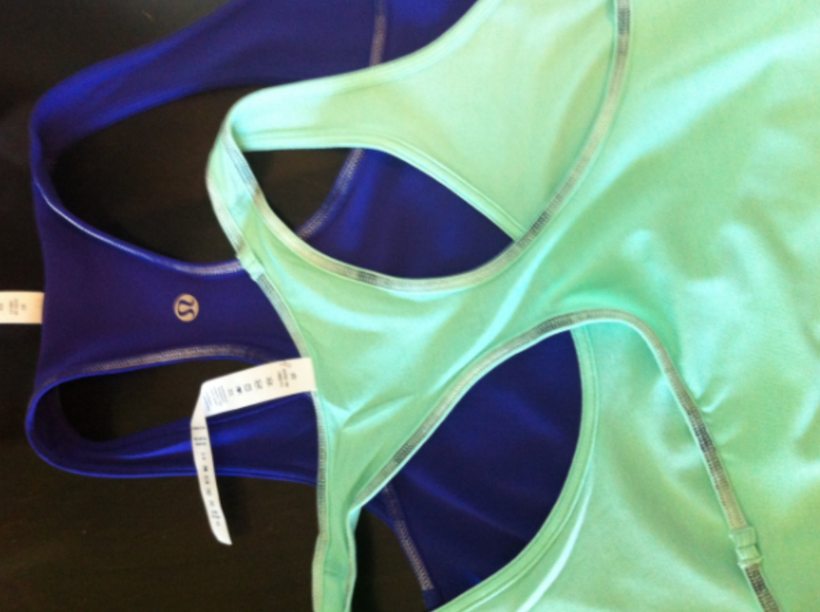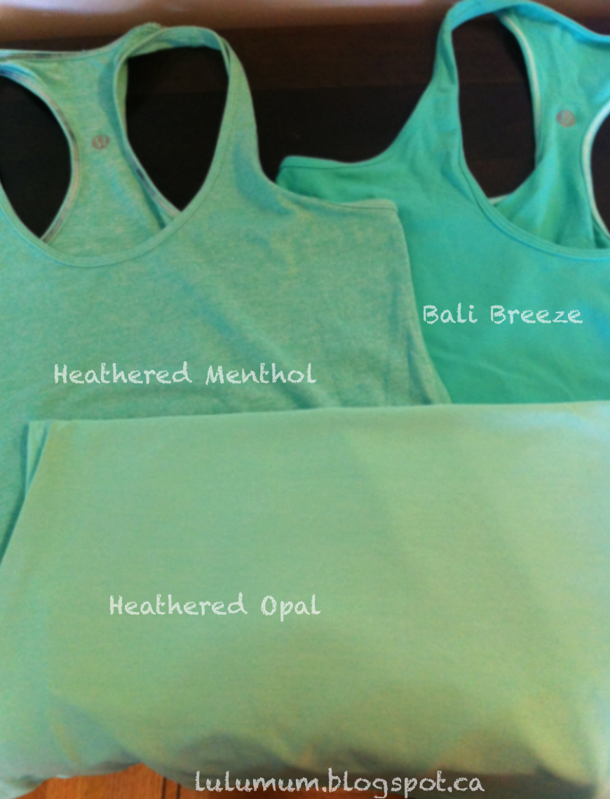 Woohoo!! Thanks to an awesome reader for tipping me off that Vancouver stores got the Bruised Berry and Heathered Opal Cool Racerbacks in. I picked up both, but I’m only going to keep Bruised Berry now that I’m home and compared Heathered Opal to Heathered Menthol and Bali Breeze. The material on the Heathered Opal is much more subtly heathered than menthol, and its also slicker. It’s not exactly icky feeling (47% Polyester), but its not as nice feeling or looking as Heathered Menthol and compared to the two other colors it is rather insipid. The Bruised Berry is divine though. Thick and stretchy, all Nylon Lycra and very opaque.