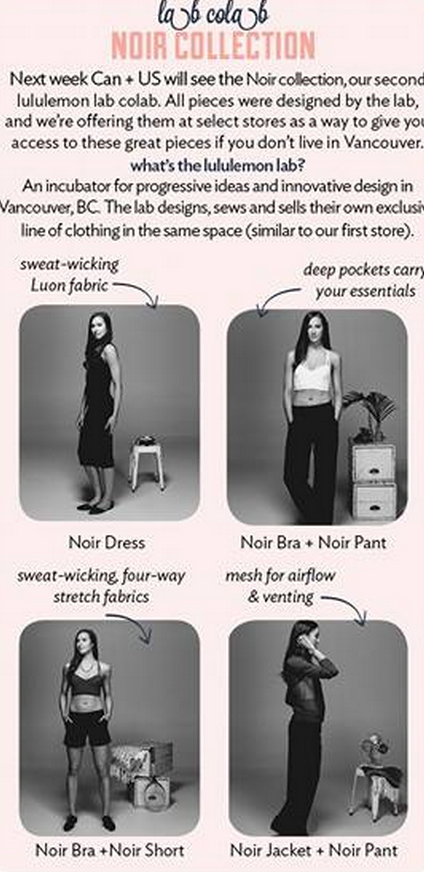 A new Lululemon Lab Collaboration will be hitting select stores this month. It is called ‘Noir Collection’ and again features a bra, masculine street to office pants, light jacket, and dress.