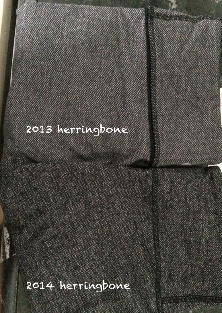 You can see in this photo that last years print was much more ‘neat’ and orderly while this years has some darker patches, horizontal shading and a smaller herringbone print. All this reads more ‘texture’ than vertical lines.
