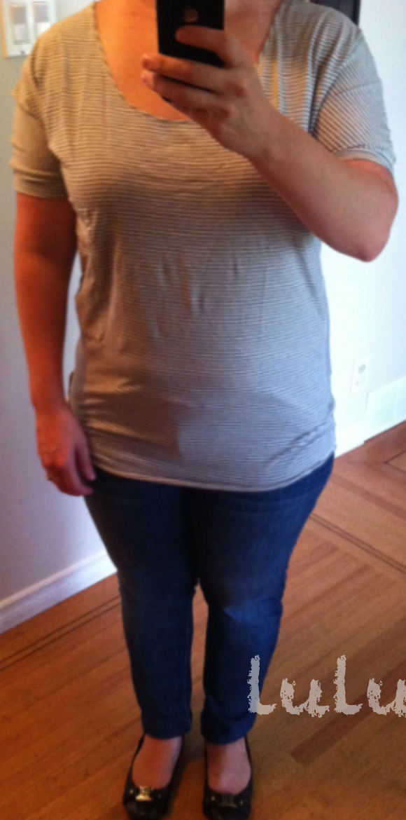 The Ravi Tee I ordered on Tuesday’s upload just arrived and I really like it. I ordered my TTS 10 in the Hyper Stripe Medium Grey/Ghost and am really glad I did because although it is loose in the chest and upper body, it is long and fitted over the hips and snug over the arms. Overall I find the shape really flattering and great for wearing over leggings. Worth noting is that the bottom hem, although stitched, is raw and so as soon as you put it on it begins to roll. Its the same at the neckline but the sleeves are cuffed and nicely finished. The giant ipad pocket at the breast is quite large but it is off to the side and in this print it is barely noticeable. I’m liking that Lululemon has come back to making soft vitasea/pima cotton tees. For the past 2-3 years they had cheapened out by making yucky burnout material or polyester blended tees and I was really missing the old designs like the Freedom Batwing, Liberty and 5yr Pima’s. I know cotton has been expensive but this is the type of product that is essential in the lineup year round. You can never have too many basic neutral cotton tees.
