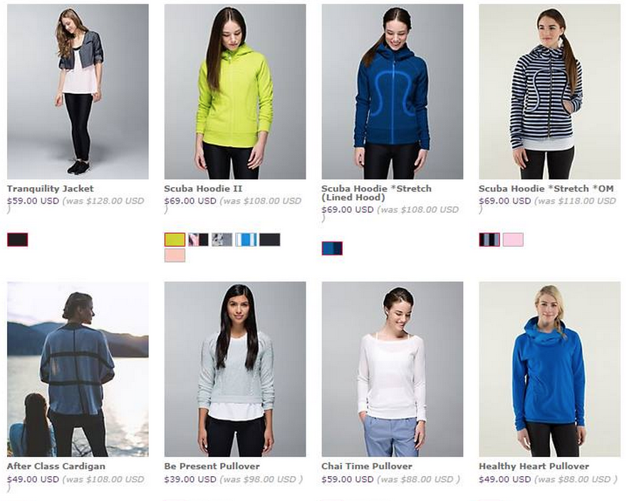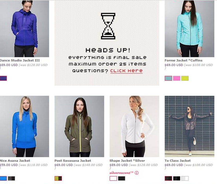 It’s up! I was going to use a sneaky way to log on but I got to see screen caps of the offerings and it wasn’t really worth it to me to go to the trouble. Although this years offerings are much better than what was offered to Canadians back in January since Canada got all of last years quality control rejects. Did you order anything off the Lululemon warehouse sale?