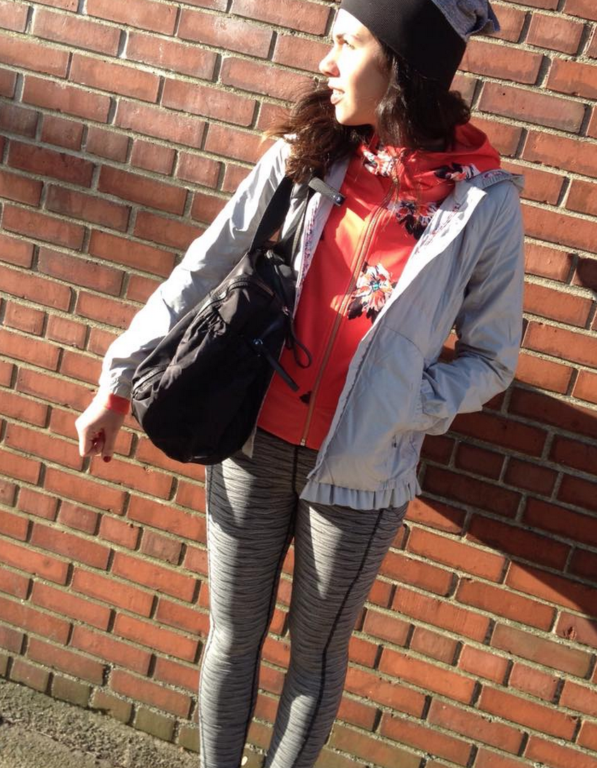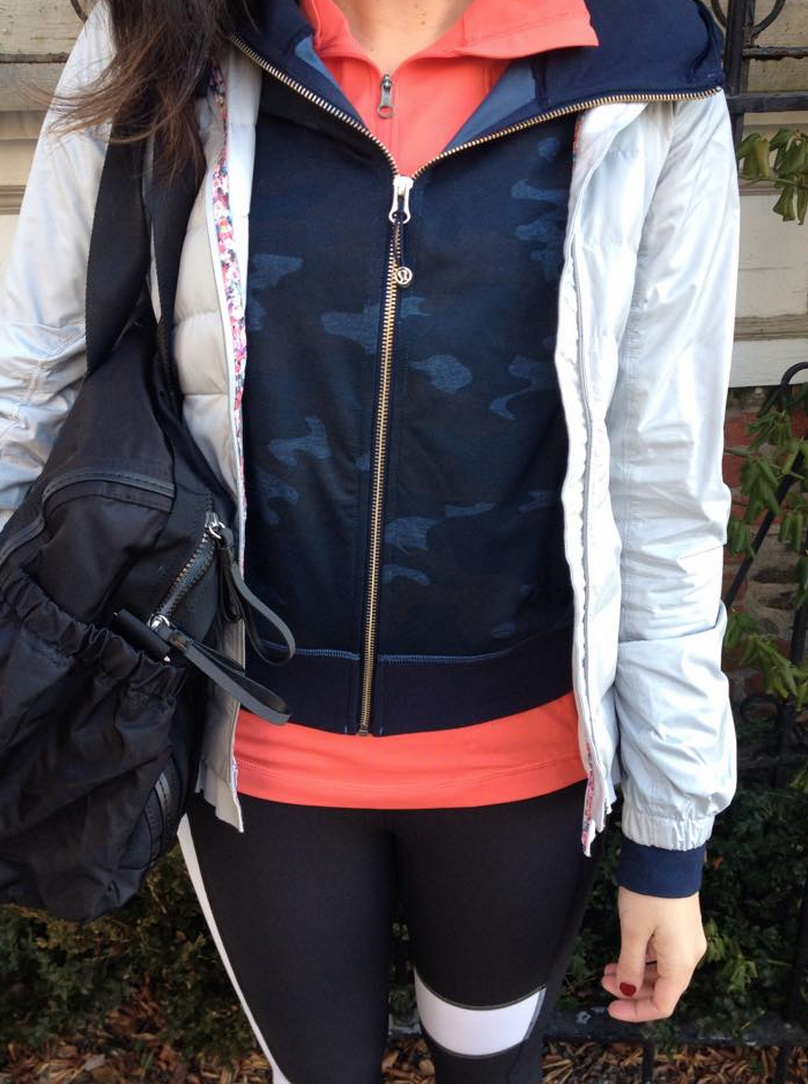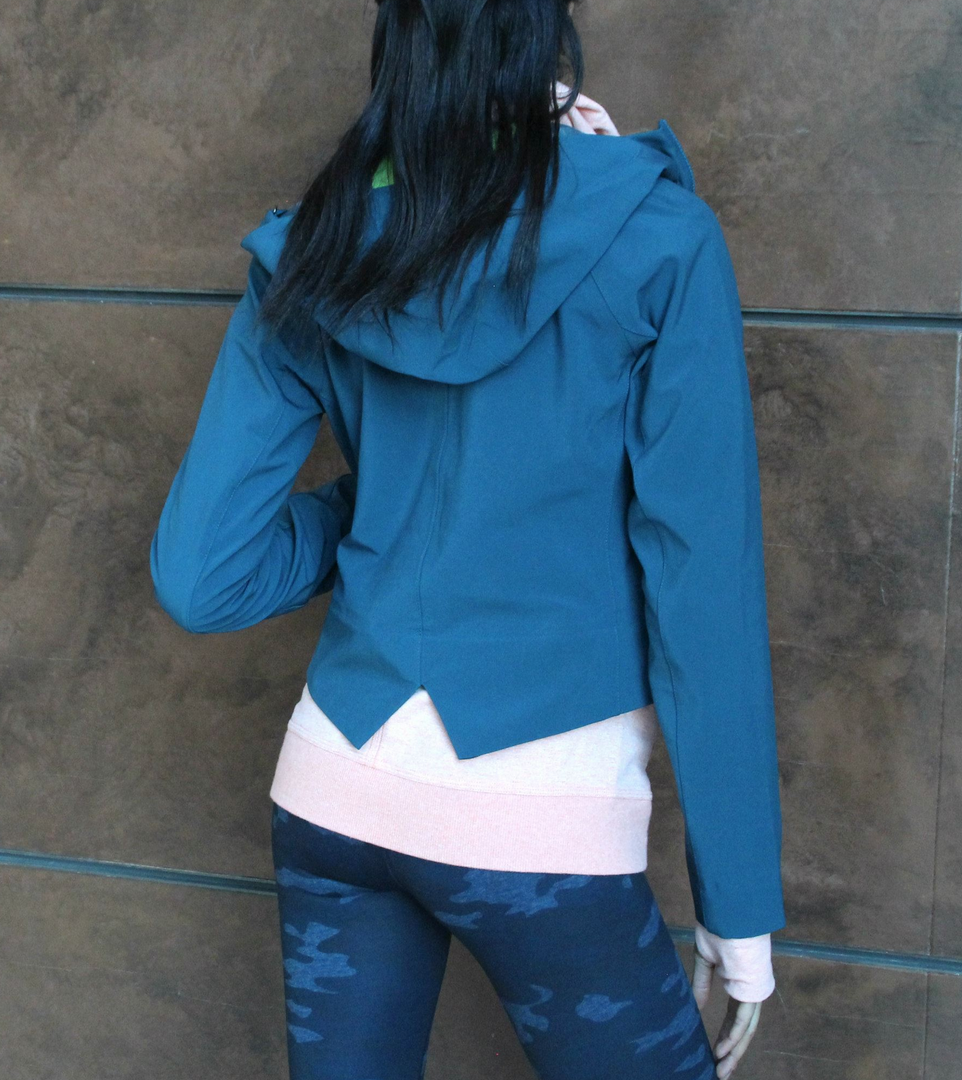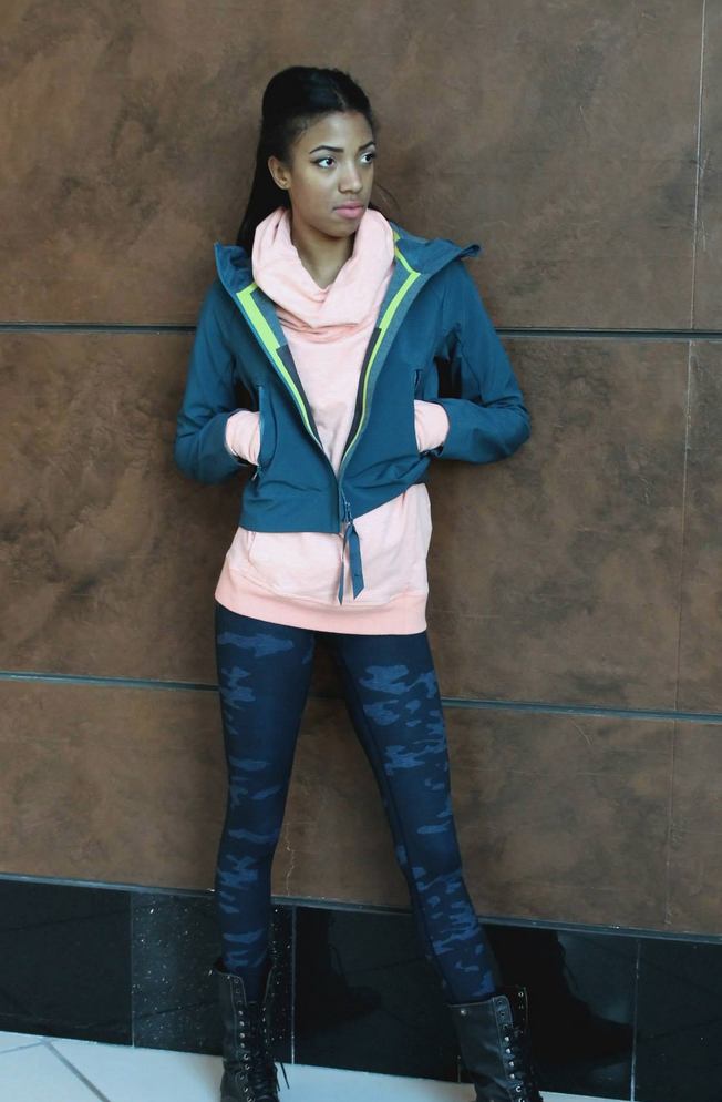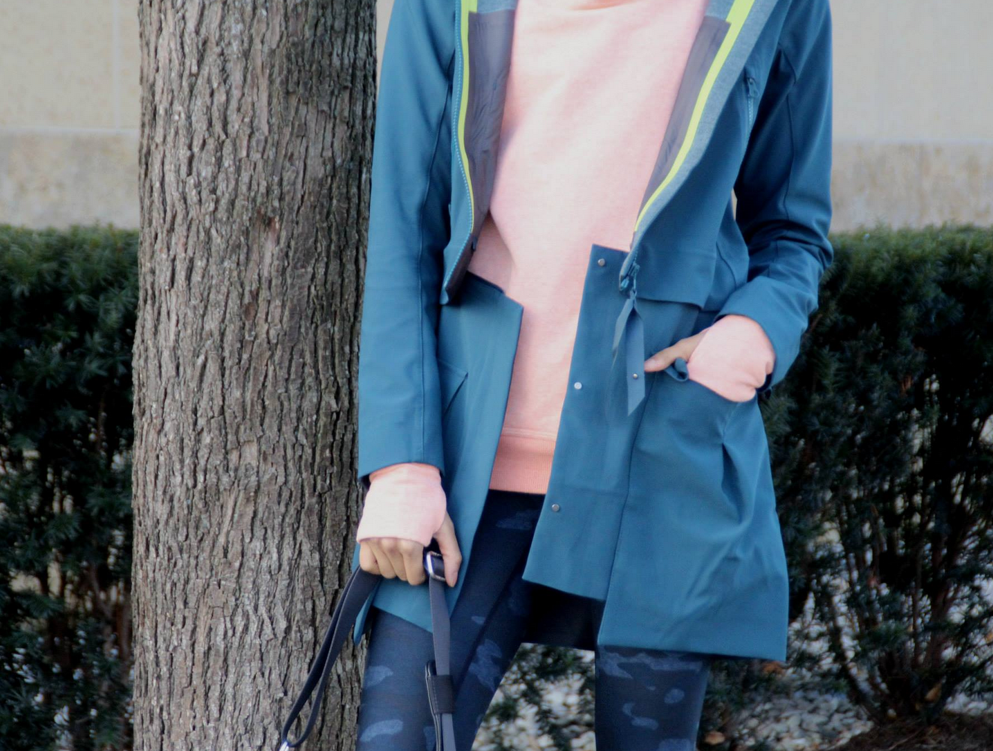 Stress Less Hoodie Peach Plum, Textured Lotus Camo Wunder Under Pants, Rain Or Shine Jacket