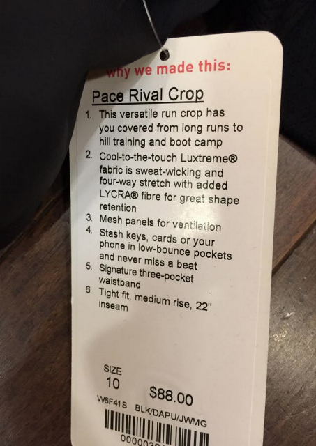 I was told by a friend today who knows a person that knows a person that the Inspire Crops are being replaced by the Pace Rival Crop which debuted today. Initially I was annoyed to learn that but now that I’ve tried these on I’m not that bothered. These new crops have a good hip pocket that the Inspires never had, plus the lower calf design is just as cute and calf flattering as the Inspires but it’s an updated look. My TTS in these, size 10, fit opaque and felt really nice on and smoothing. I didn’t have Inspire Crops on hand to compare but I’m pretty sure the rise on these are slightly higher. The mesh design on the back goes quite far up to halfway up the thigh which is great ventilation if you are like me and prefer crops in the summer vs. shorts. Overall I really liked these but I have enough run crops right now so can’t justify this purchase.