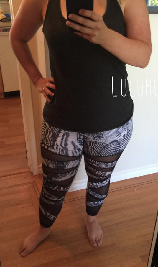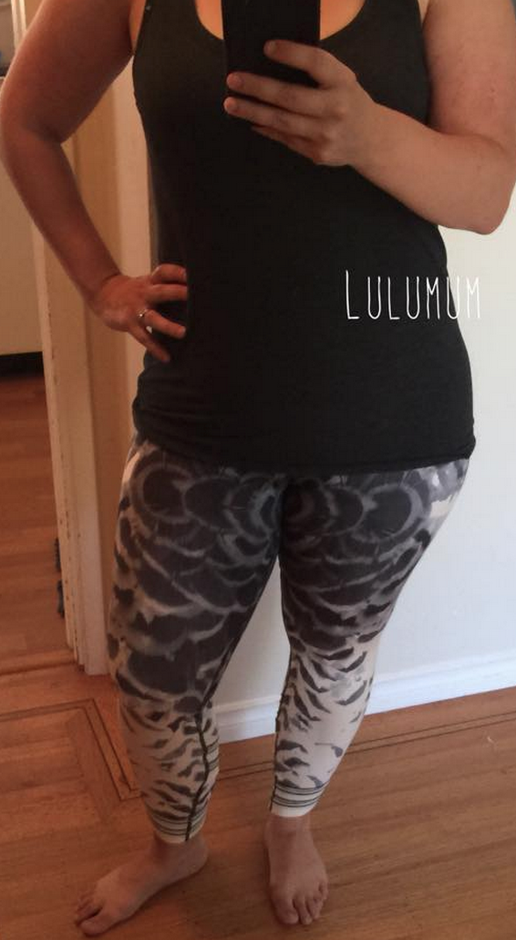 The Pretty Plume High Times I’m liking a lot actually. I thought I’d try them on and hate them on me due to being curvy, the print and that it’s a light color. Actually, I really like them and I find them much more flattering than I expected. Even with the owl eyes up top. I ordered my TTS 10 and they are hard to put on, even over the calves. Very little stretch in these and it seems like it’s a new luon blend material for lululemon. Snug compressive fit and very little sheerness for such a light color. The material reminds me of Onzie but way more substantial. I suggest staying TTS and battling putting these on because once they are on they are perfect. sizing down would be totally impossible. I’m a bit torn though because despite loving these I’m not sure I’d actually be courageous enough to wear something like this to Crossfit (I’m starting that up full force in September), and I doubt I’d wear these casually. There is my dilemma with pretty lulu pieces where the prettyness overrides it’s function.