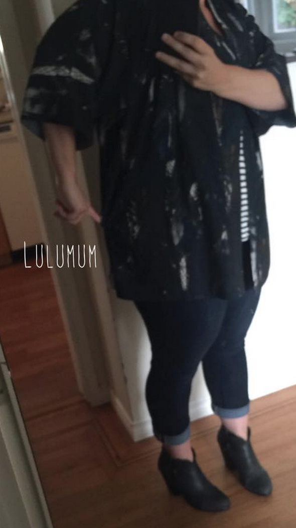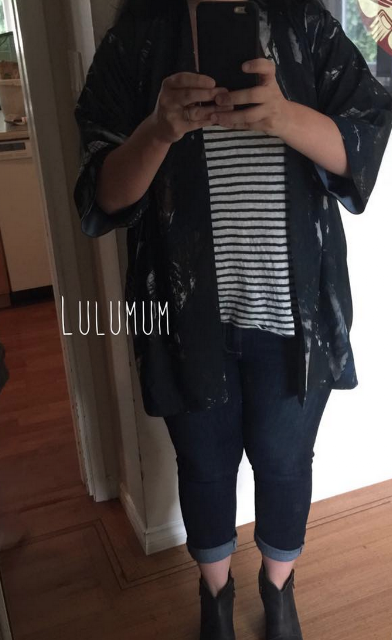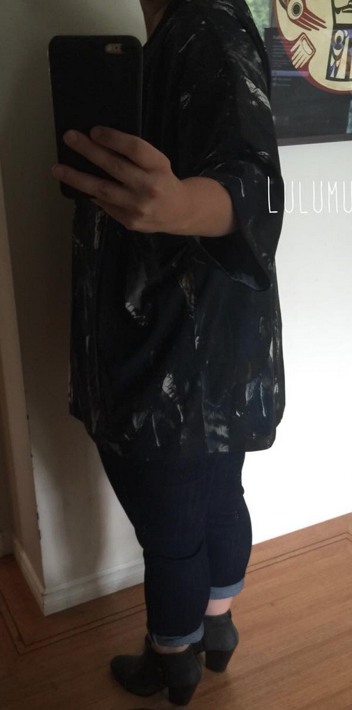 This is the size M on me and I typically take a size 10 in jackets and cool racerback tanks. The M is perfect, roomy and relaxed fitting. The only indication that this is a smaller size on me is that the pockets are set back a bit on my hips vs. being positioned on the front of my hips. I can wear the kimono fully closed in the front and overlapping so it’s not short on material there at all. I think this Kimono looks best either dressed up with skinny or straight legged jeans, or worn as a pool coverup. For some reason I don’t love it with casual luon bottoms. If you are a size 8 or 10 you can easily pull off the size small, or medium or you could try the L but ideally you would get the M. If you are sizes 2, 4, 6 you would probably want to stick with XS and S.