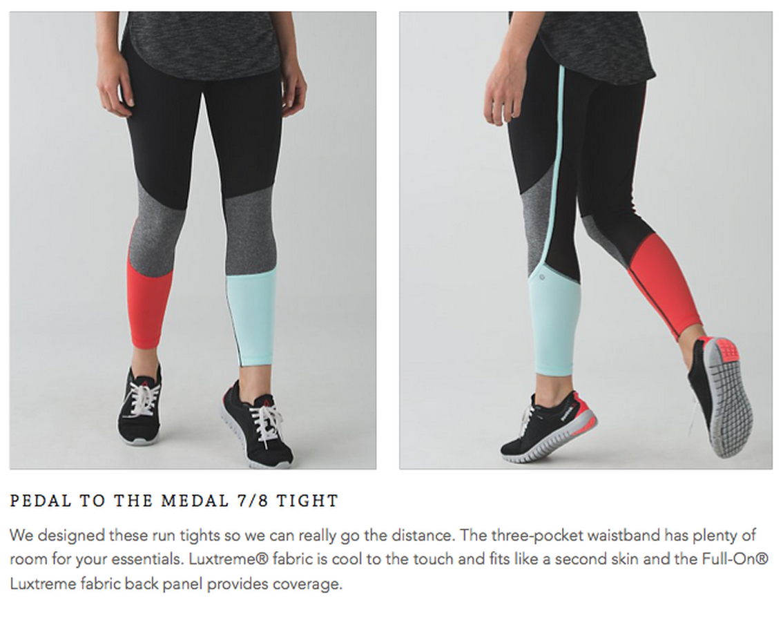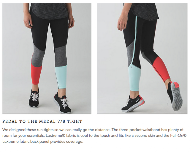 I'm interested in the Petal to the Medal Tights, but not in these colours. I like the Grey/Angel Wing on the Aussie site and hope we'll get those. I just ordered the Wee Space grey Inspires on Tuesday and am really not in the market for more than one pair of running tights at this point. I'll only get one. I'm liking the colour blocking on the PTTM ones; I hope they'll have them in store on Tuesday so that I can decide which pair I want.