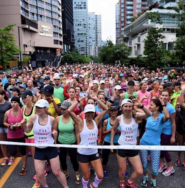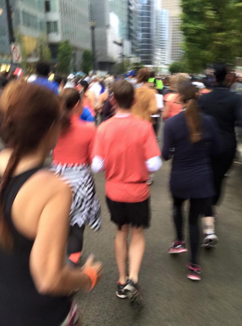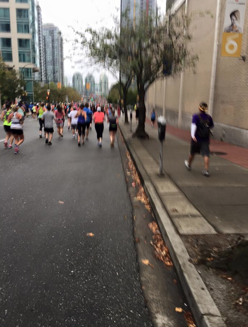 It was pouring rain on Saturday morning and very dark so I was having a mini freak out about wether or not to wear a Tuck And Flow LS over my What The Sport Tee. After talking with my coach via text (she was racing SW too this weekend) we decided that I’d be fine without the long sleeve and I just needed a hat or visor which I had. I stopped in at Starbucks and grabbed an espresso to gather myself before meeting my team at their hotel and to power me through the morning and I’m really glad I did. I needed that coffee after a sleepless weekend of shopping shenanigans. It was a lot of fun walking with my group to the coral and getting pumped up by the crowd together. We didn’t race together as we all have different times and goals but we were a team anyways with matching outfits. By the time we where walking down to the race start it had stopped raining and it was a lovely cool 14*c with overcast. Perfect running weather! Especially after the heat wave Vancouver had just a few weeks ago. So many people had personal bests this race and I think it had a lot to do with this great cool weather after all that hot weather training.