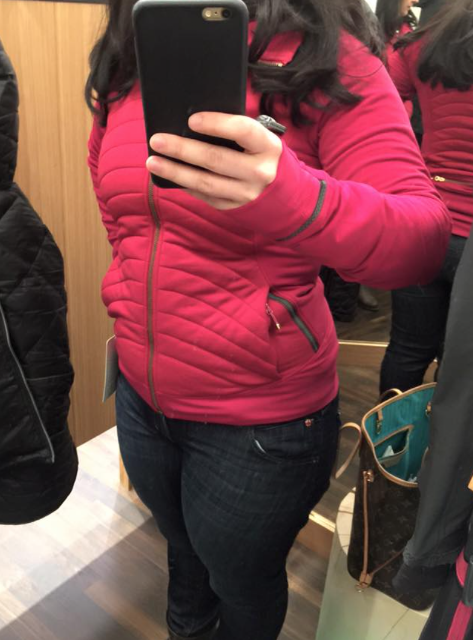 The Fleece Out Jacket was really nice, especially in this  Berry Rumble Color. It also came in black. It was a form fitting TTS, although I did have a thick sweater on underneath so I think it would have fit better with a tank or tee underneath it instead of something bunchy. The material was a soft spongy  tech fleece on the outside (sort of like the nike dry fit sweatshirts) but fuzzy tech fleece on the inside just like the Toasty Tech II Tights. I liked the quilting on it a lot. My only negative with it is that the front pocket sort of puckered out a bit on me but if the price had been right ($168ish) and the color had been something I loved, it would not have been a deal breaker. The deal breaker for me was the price. I know Nike has a hoodie that is priced in the $250 range (I’ve tried it and really liked it) so it’s not out of line for Lululemon to go with this sort of pricing,  but I can’t get behind that price point for a hoodie. I’d rather pay that for an outer layer piece.