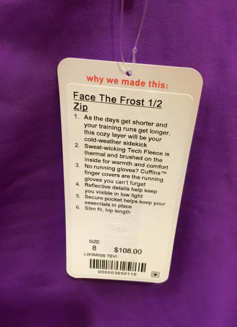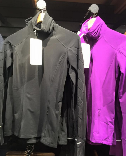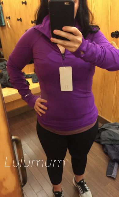 I accidentally grabbed this in a size down which would normally not be a problem for me in a stretchy pullover but because this is tech fleece it lacked the stretch that luon has and it was tight going over my head and my shoulders. Once on it was comfortable and looked nice but I definitely needed my TTS in this and would even possibly consider a size up, just because of the lack of stretch. This came in black and Ultraviolet (I think that’s Ultraviolet – TEVI). Tender Violet!