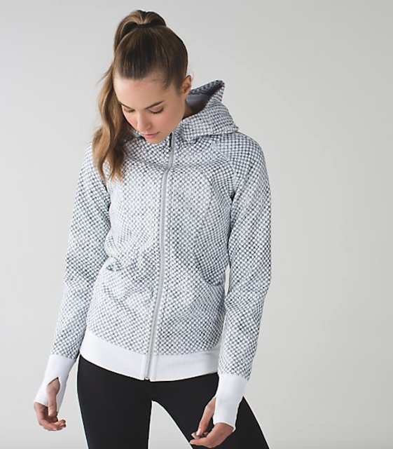 I saw a vinyasa scarf in the white print in a store in the Toronto area. It's fleece. I didn't notice th scuba iii in with print though.