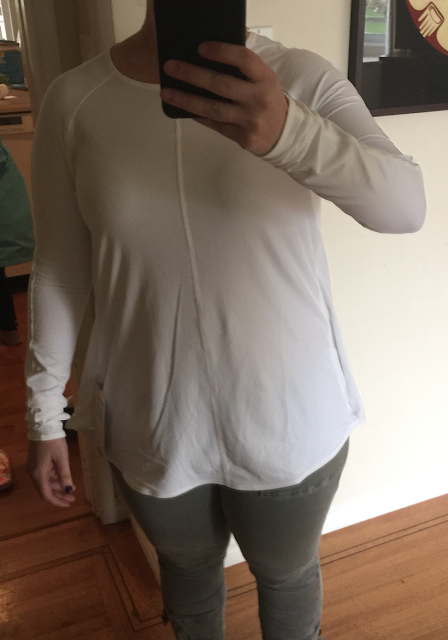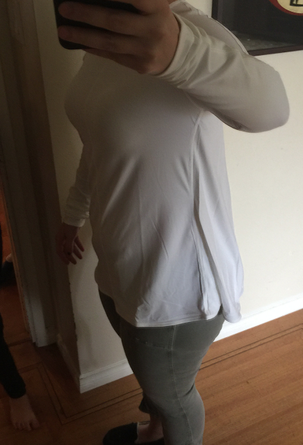 I had a really fun shopping date with a good friend of mine today and we went to Nordstrom’s for bra and undie shopping, as you do, and we totally bypassed the athletic department which is just crazy. This is why I didn’t get to even look at the Ivy Park stuff for the few of you that are interested. Next time though! We both ordered the Making Moves Long Sleeve which awaited us for try ons when we both got home (respectively) this afternoon. She got her TTS in black (which I tried on the other day in my TTS) and I ordered the white in a size up and we exchanged text photos of them to each other. Her concern was because she is larger in the bust and very petite and slim that a top this cut would look like a tent – and I don’t think it did based on the photo thanks to the seaming detail, the neckline and the snugness over the bust and in the arms. We worried that the white would be too white and tenty and that I should probably exchange mine for black. When I tried it on though I actually really liked it a lot. I like that it hugs at the bust and then flares out a bit and in profile you don’t get too much of a triangle shape. For my shape, sizing up was definitely the right call, particularly in white. For my friend, her TTS was loose in the bust. Many people are buying this top in a size up in store though to allow more room in the hip. The white is very thin and shear but it’s also extremely soft and really pretty on. I just feel very paranoid that I will get makeup on it or something that will be very obvious and won’t wash out. I also worry that with the white you have to be very choosy on what you layer under it since it is so sheer. That being said, my white striped Tuck & Flow gets thrown around at the gym and it’s absolutely fine. I’m definitely leaning towards keeping this one.