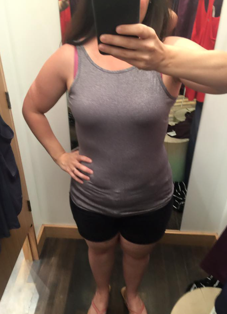 I HATED the neckline on this tank. I don’t mind a higher neckline that scoops in like this but the proportions where off. It’s sort of a weird almost boatneck with wide straps, but then the chest carves in. The back scoops down so low that it exposes my bra line by a lot. You’d have to wear a long line bra with this and show most of it. Black, White, Grey, probably Bordeaux as well.