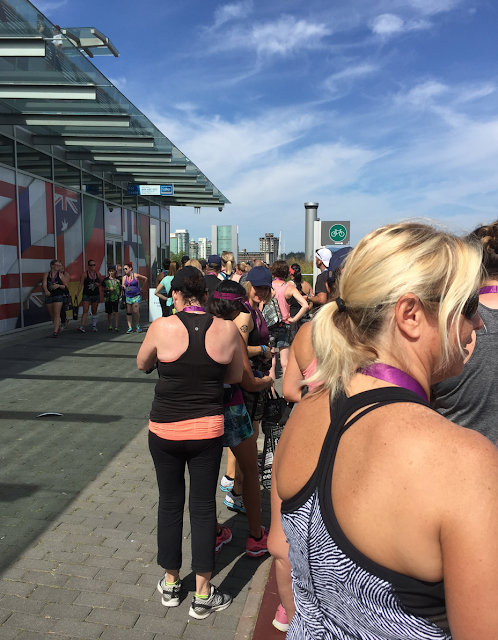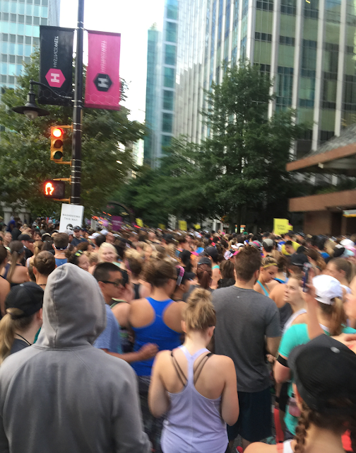 The crowds in the corral. Note the wonderful colourful prints and outfits. Lululemon’s new designers need to observe this live because this is what Lululemon is all about. Not neutral edgy colors full of attitude and airs.