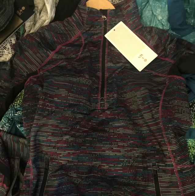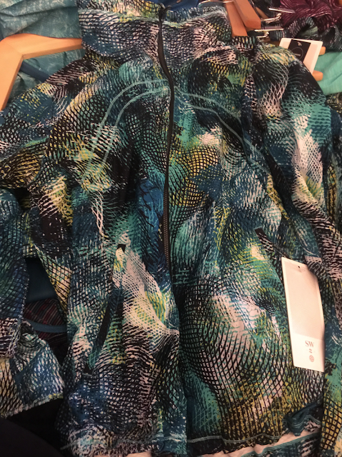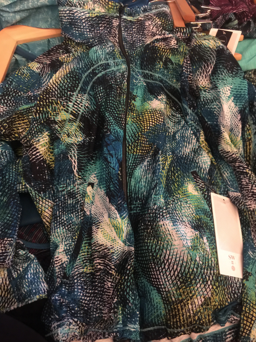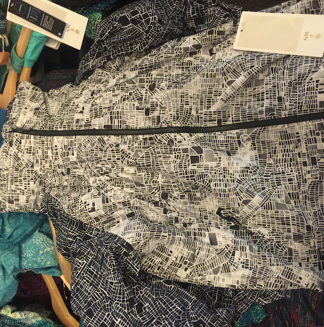 I was totally enthralled with this men’s jacket print. I loved the color, loved that it was a blue print map of Vancouver. I love everything about it. I so wish the women’s line had this print in something like a long sleeve top or a Cool Racerback, or even the Gather Me Slightly Jacket. I was so close to getting this one but the medium was huge on me in the arms and chest and really long, and it just didn’t look right on me. My friend convinced me that the GMS jacket was so much more of a flattering fit and much softer on the inside. I don’t regret not getting this, I just wish there had been other items in this print. It’s so special. Honestly thought this years theme and the concepts for the prints where so great. Cypher codes, binary codes, city blue print maps, city ground maps, abstracted finger prints. This was such a great way to use prints to depict the ‘Agents of change’ theme.