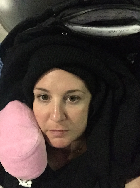 My gear. Backpack as pillow, neck pillow, camping mat, blanket and a good book. I’m reading ‘The Mandibles’.