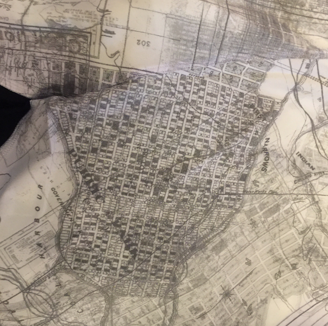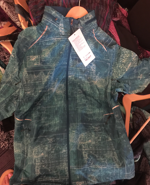 I was really bad about taking pictures in the showcase store this year. My iPhone kept taking really blurry pictures, but also I was extremely tired from the long lineup and wasn’t thinking straight by the time the store opened. I was in survival mode without coffee and I just wanted to get through it, grab what I wanted and go home to bed. Luckily, this year a few lucky volunteers got to shop the Thursday night because they had volunteered 5 years in a row. They where not allowed to share photos of the store or the products but people left the store with their new purchases and we where able to glimpse a few of them. Enough to form a plan of what I ‘had to have’. I knew that I *needed* the Gather Me Slighty Jacket with the ‘figure ground map’ of Vancouver so that was the first item I grabbed in the store. I then grabbed the finger print version of the jacket, and the men’s city blue print jacket, one of each Cool Racerback in my size and the duffel bag. I really didn’t want to spend a fortune in the store so I took my time deciding what I needed to have and despite really loving a lot of the items this year I left with only the Gather Me Slightly Jacket in both prints.