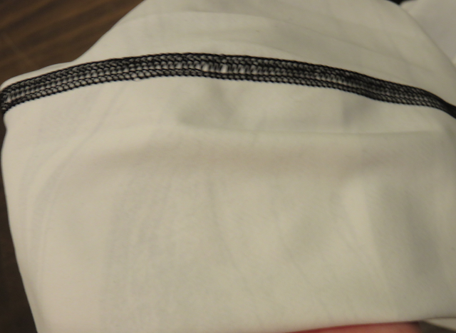 Issue #3, because of the nature of this material and the way the design is in the front torso region, this will give the illusion of camel toe. Actually, the material itself will cause minor camel toe, and then the print will really highlight and exaggerate it, and then the black contrast sticking will put an exclamation point on it. Hence, my tee pulled down to cover the area.