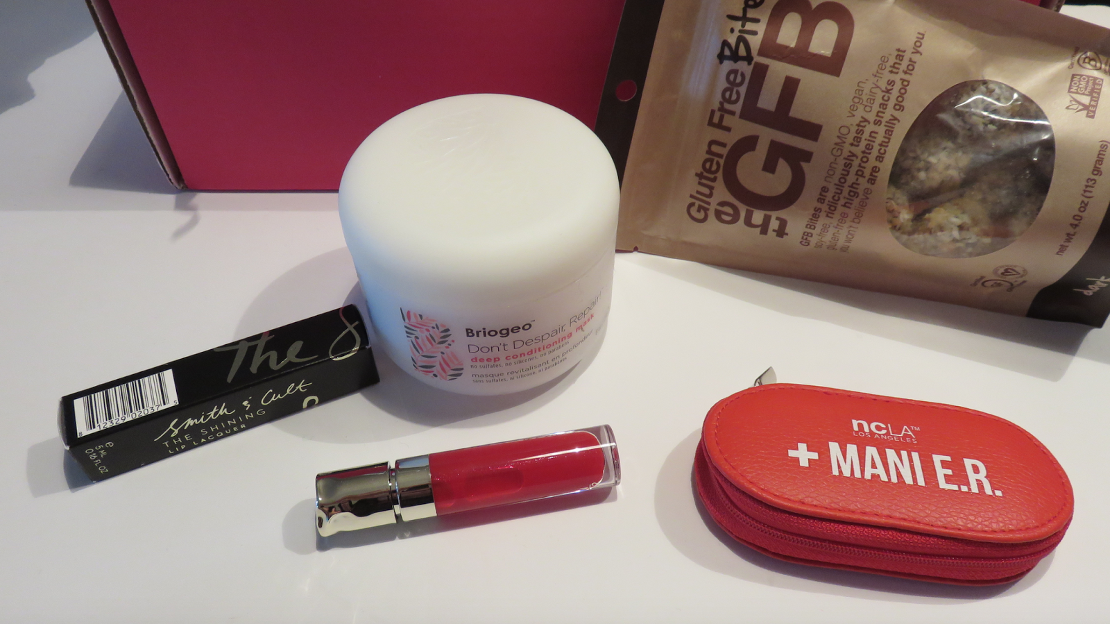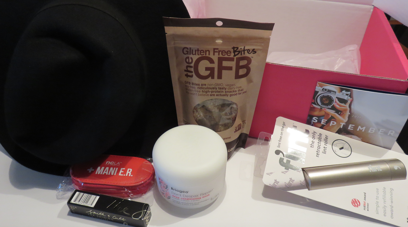 Jack & Lucy Hat, NCLA Mani-ER Tool Kit, Briogeo Conditioning Mask, Flint lint roller, Smith & Cult Lip Lacquer, The Gluten Free Bites