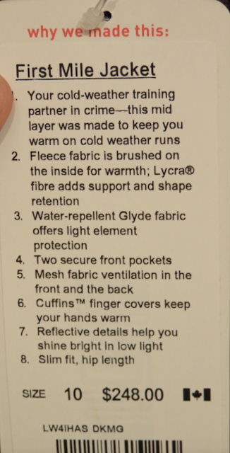 First off let me say everything looks good on you but I think the Brave The Cold Jacket on you is my favourite. It's too bad it's so damn expensive. I tried on the First Mile Jacket and I feel differently than you about it. I found my tts fit a big snug in the underarms and I don't know if that is because of the detail in back or just smaller cut armholes. Normally my size 6 is fine in that area. I do love the style and fabric of this jacket but I actually like my fleecy keen better. I found the sleeves quite long and there are no thumbholes which I like when the sleeves are really long. Yes it has cuffins but normally they always have thumbholes as well and that was a miss for me on this jacket. If this jacket had come in some other colours that I loved it would have been hard to leave it behind but I already have the Deepest Magenta Rush Hour Jacket and a black Kanto Katch Me Jacket so I didn't want those colours and I don't wear white jackets and the olive doesn't look good on me. I guess it wasn't meant to be…