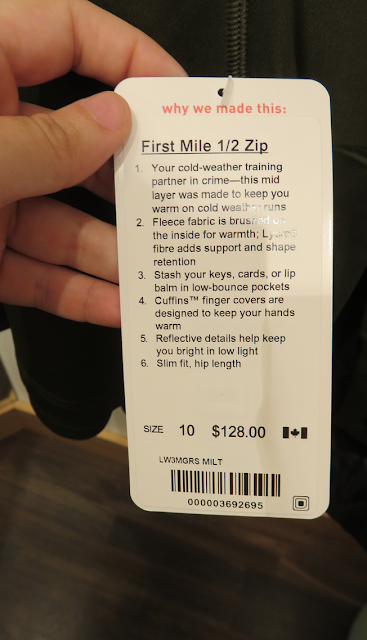 I also tried on the First Mile 1/2 zip and I think this tech fleece pales in comparison to the Face The Frost 1/2 zip which by the way is on WMTM in the US. I like the style and detail better on the Face The Frost tech fleece and I didn't like the elastic waist in the back on the First Mile 1/2 zip. Again I am not loving the colours in this so it makes it easy to pass it up.