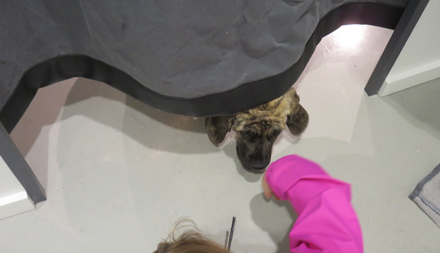Here is a cute puppy playing with my kids while I was in the fitting room.