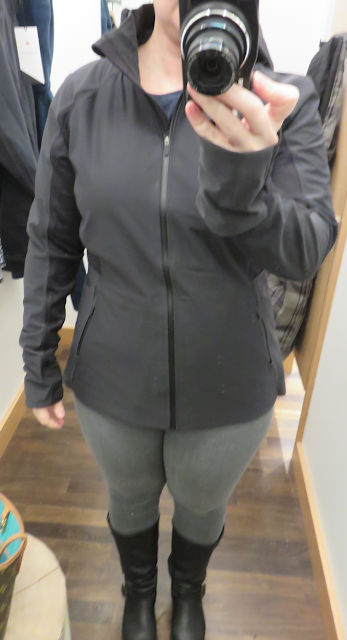 I liked the Sleet Sprinter Jacket today. It’s got a very streamlined elegant look with the pleated back and taped zipper. I have the &Go Anorak from a few years ago that I got on sale and it has similar stylings so I didn’t come home with this, but I did like the overall shape of the jacket. I needed a size up in this to layer over a RULU long sleeve and so that the bottom flared out nicely but the TTS was fine too. I don’t think the price point for this jacket is correct though – it’s not water proof despite having a taped zipper. The underarm panels are a polyester knit tech fleece so thats definitely an area where water will come in – but it’s nicely warm and soft on the inside. I think this will be great for cold winter runs that aren’t extremely wet. The zipper peep hole for a run watch is a really nice feature. Overall this jacket is really nicely designed specifically for run, while still having a really sophisticated urban look. This is something I’ll be watching for markdown.