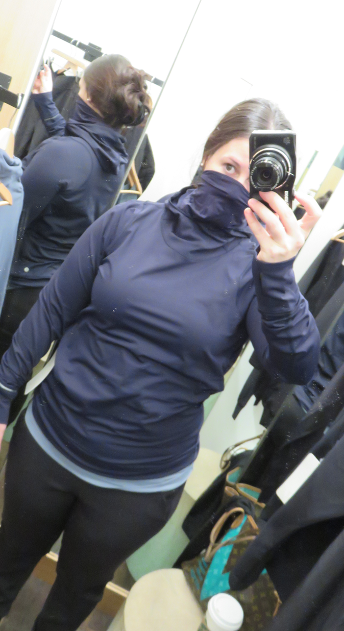 I just realized that this was a size 12 and not a size 10. That’s ok, I liked this fit. I didn’t love the inner mesh neck as you can see from this first photo. It’s very stretchy but also tight so if you get frustrated like I do by getting your ponytail all messy then you will hate this feature. It’s perfect for cold weather runners though since you can pull it up over your face balaclava style. Brushed luxtreme is a really nice, soft and cozy material without looking especially cozy.