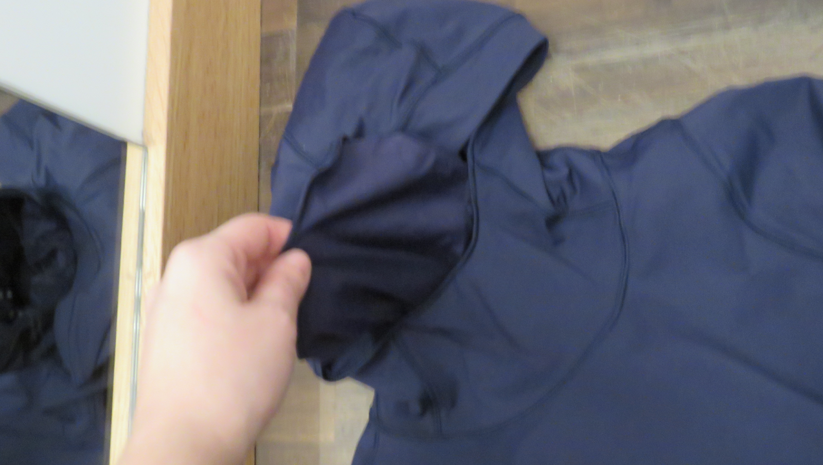 Sorry, I didn’t realize this photo was blurry at the time or I would have retaken it. You can see the inner neck warmer is attached. I would probably cut this piece out since it’s not useful for me and it’s more of a nuisance. If you use this for running outdoors it’s a great feature though.