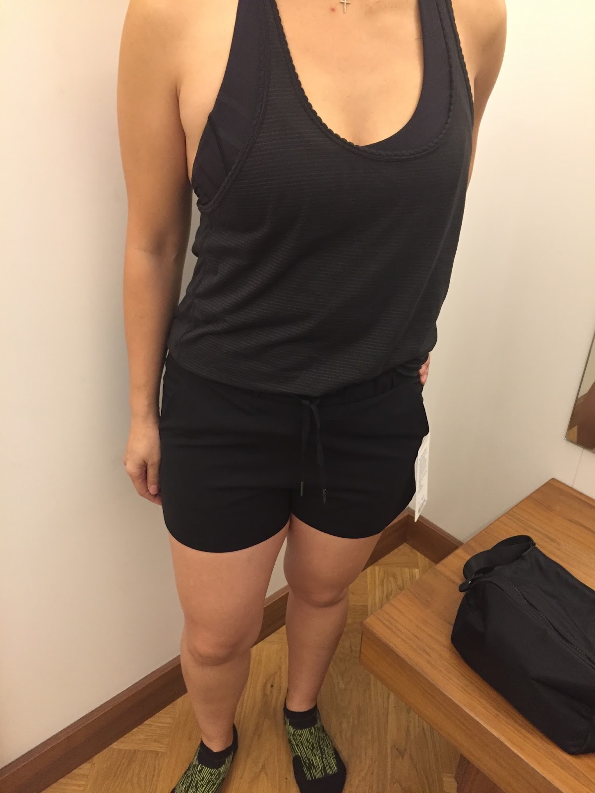 I tried on my TTS 6 in the On the Fly Short. It fit comfortably in the legs and waist but if you have a bum, the pockets stretch funny and pucker. Unfortunately, I didn’t have time to try on a size 8 to see if I had the same problem. I did like the feel of the fabric (very soft) and the length. I didn’t realize my tank was skewed until I came home and downloaded the pictures.