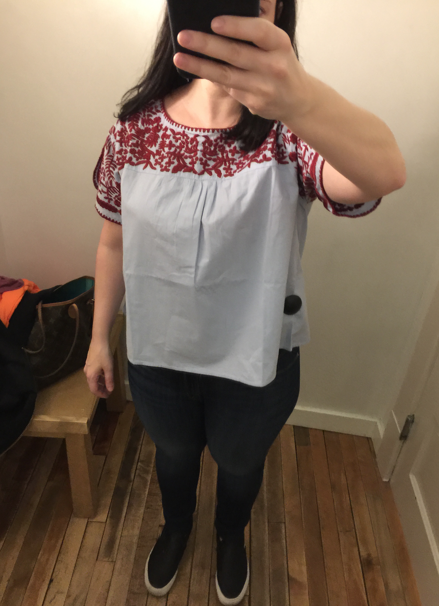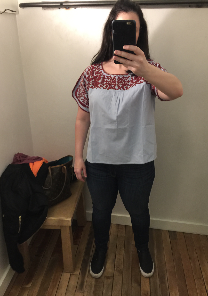 since last year I’ve had an obsession with pretty contrasted embroidered tops. I purchased a couple of blouses last year from Aritzia and wore them like crazy, and I’m still excited to wear them again this Spring. While in the Seattle Anthropologie I saw this top which I had already seen a few times on my Facebook news feed in the form of targeted ads (creepy much?), but it was an online return so it was the only one they had and it was a size M. The fit wasn’t bad, it was just a touch cropped for my liking. I decided not to get it right then and there since the length was a bit short, but now that I’ve thought about it for a few days I’m going to order it online. What do you guys think? do you like it?