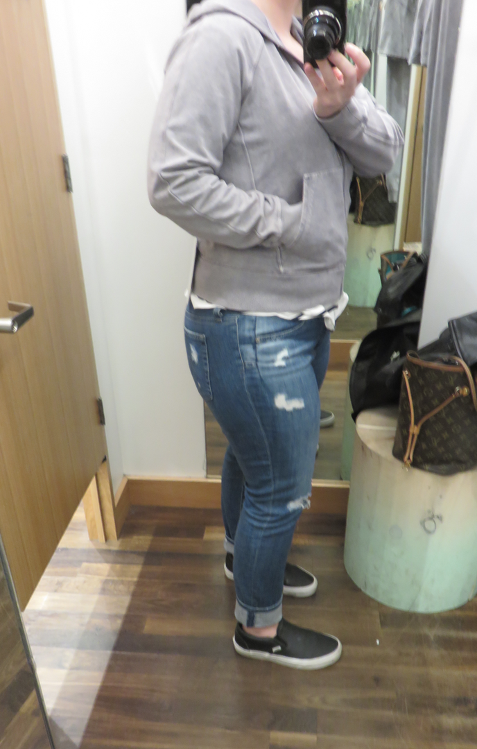 This was slightly tempting because I really liked the distressed color, and the softness of the french terry, but I was surprised at how loose and boxy this was. If this had been in the cut of many retro lululemon hoodies with the longer length and contouring in the waist, and oversized hood I would have been all over this one. Those old styles really emphasized curves, waist and boobs while this really hides my waist and boobs. The style and fit of the cut of this was a pass but I may go back tomorrow and try a size down and also the acid washed black, just in case the size down solves the boxyness issues.