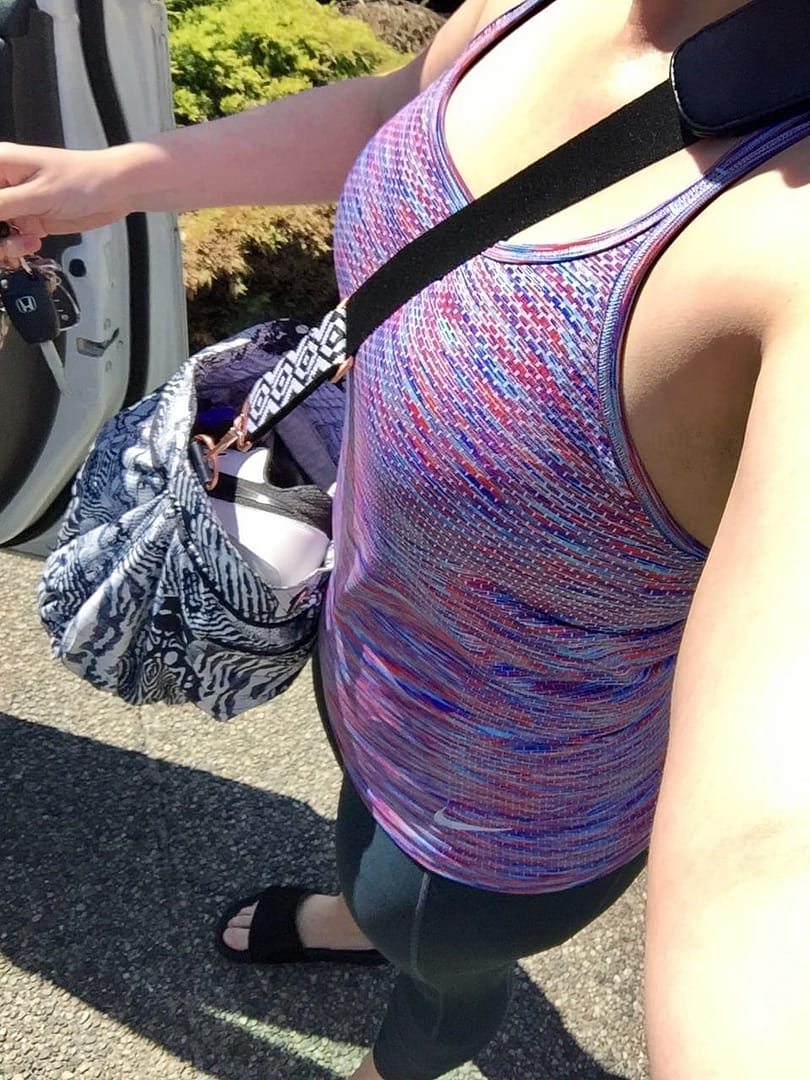 It’s a gorgeous day in Vancouver today at 30*c and high UV index so I was really happy to wear this nice cool and breezy tank for todays workout. Lots of bunny hops across the gym with the bar in snatch position overhead, and behind the ears. Fun times! I hope you don’t mind another Nike OOTD but this is my new favourite outfit combination and I had to share it. The bright colors are giving me life! I have a post coming up about this tank tomorrow. The bottoms are the Athleta Mantra Capri‘s I reviewed the other day. They where awesome for todays workout, even in this heat! No creepy sweat marks, no yanking them up constantly. They where perfect! It’s always a really good test for how well pants are going to stay up when you have to do bunny hops across a gym and your hands are busy holding a bar so you cannot yank your pants up as they slowly creep down, revealing your butt crack. This did not happen today, but it has in the past.