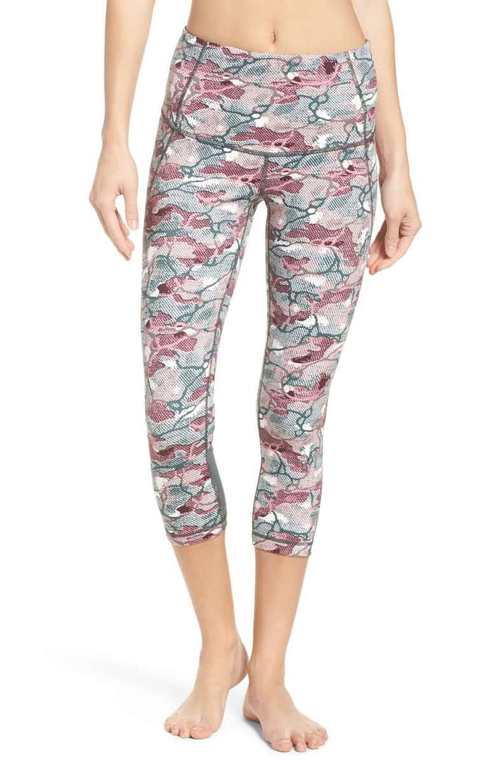 Camo prints are right up my alley, and so is the ‘it’ color of the year, blush. This was a nice combination of the two for me. There where some great blush colored Zella leggings on sale during the Nordstorm Anniversary Sale but all over blush leggings are a bit scary for my curvy figure, and this camo is a nice safe alternative for me with the added bonus of camouflaging my flaws. I think the pricing for these Zella leggings are a steal and I would have purchased them but I think I prefer the blush space dye gradient ombre zella leggings (shown below) but my store didn’t have them in yet. If I can get my hands on those to try on I will do a fit review and let you know how they fair as far as opacity and feel. I’ll definitely be looking more at Zella for my plain black high waisted leggings since they fully meet the function I need for Crossfit, are nicely affordable and great quality and wash really well.