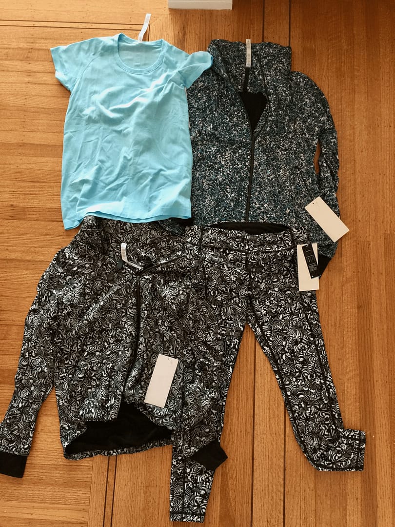 I did see the heathered green swiftly with the marled color (green/black/blue) and it was really nice and soft. I actually had it in my size but ended up putting it back. I also had the nulux crops in the same print as my speeds but with a dark blue background, not white. Had they been the white print I would have gone with them but the blue was less versatile. I also saw but not in my size a few of the orangey pink swiftlies. They where really pretty and I opted to not hunt them down because I have an orange swiftly that I really like. This swiftly was way more muted orange than it was pink btw. There were also lots of bras and lots of backpacks. I had my hands on a tofino print bag but I put it back. All of the Cool Racerbacks that I saw where cropped, and I assumed the normal ones where sold out but I later found out they only had cropped CRB’s.