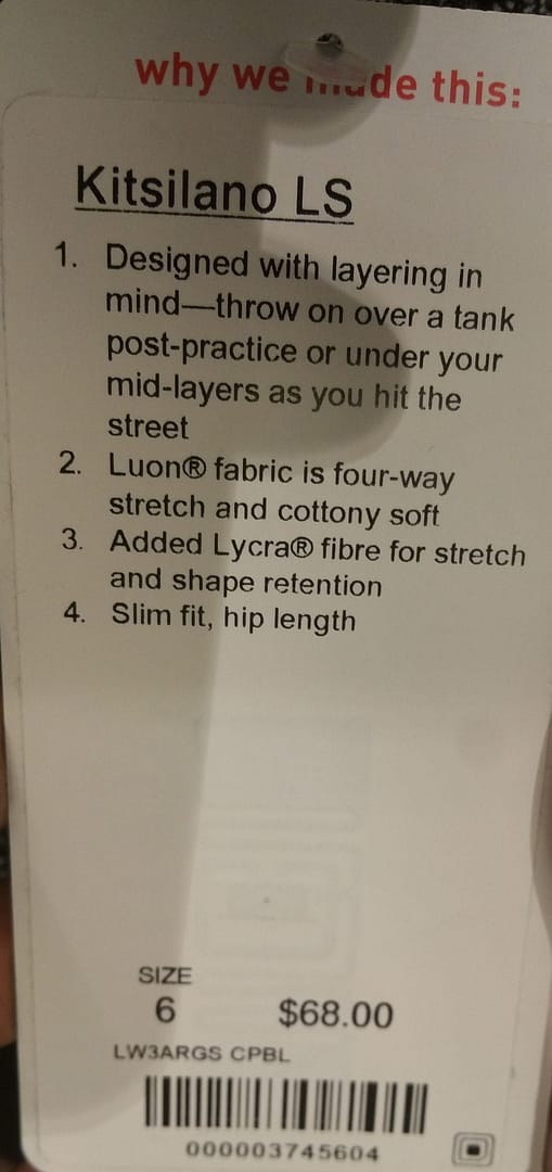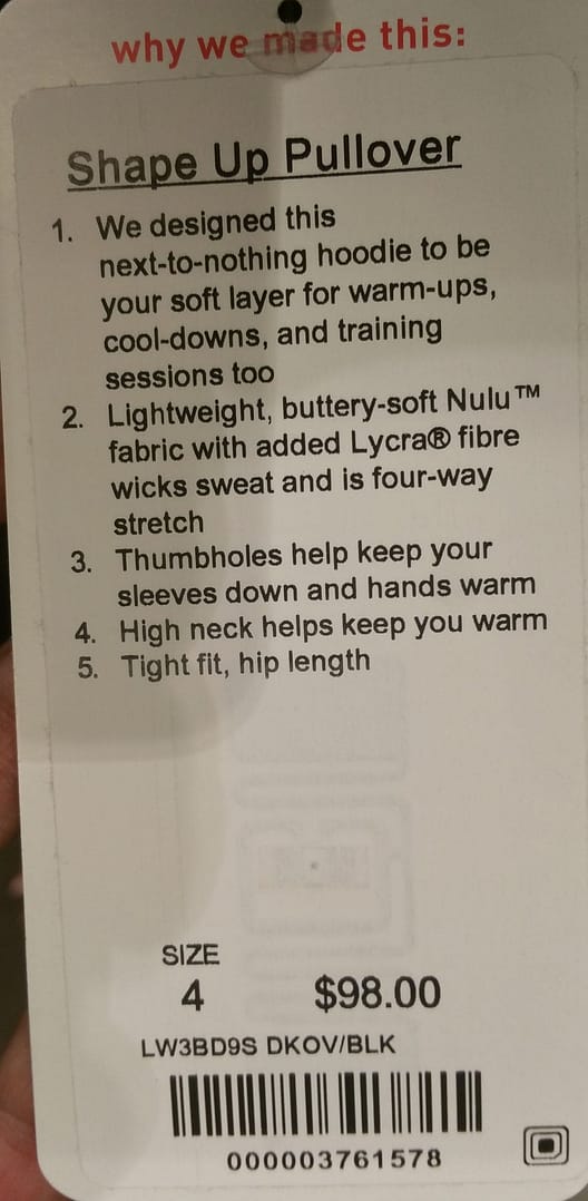 I finally got to the Santa Monica 3rd Street Promenade location today. SM was the only store that had the new items. The Shape Up Pullover was soft and very form fitting. In this picture I’m wearing my TTS. There was barely any difference with a size up — the length was a bit longer and like others have mentioned, the shoulders were wider than I expected in a size up. Everywhere else, I thought the fit was the same. If I end up buying it, I would probably get the size up so I can wear a Swiftly SS under it. I didn’t mind the color blocking as much as I thought I would. The navy version has a black color block that is barely noticeable. So, for those that don’t like the color blocking, go with the navy. It’s too bad this didn’t come in a nice plum, brighter green or brighter blue color. I have to say it was very comfortable on. It didn’t move around the hem and really felt like I barely had a top on. It would be great for runners. I’m undecided so it stayed at the store.