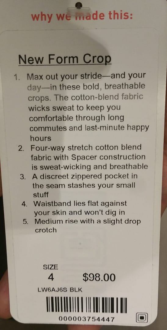 I was really loving the idea of the New Form Corp until I tried it on. I think it is by far the most unflattering Lululemon item I have tried on. First, the spacer fabric was stiff. However the item was folded when shipped, it made the side of the pants pucker oddly. I wasn’t sure if it would straighten up once it was able to relax and just hang. The puckering looked so bad, I had to angle myself so you could get a better idea of how it should look. Second, I think these crops “add” weight. They are not slimming at all. These crops are TTS and had plenty of room. The formed waistband was not as tight as the NTS Jacket cuffs and waistband. These pants hit my calves at the worst spot. If I was considering it, I would definitely have to get them hemmed to the right spot. The length is great for the long legged ladies out there but I’m not sure how flattering it would be on. Even on the site, it doesn’t look that great on the models. I suspect these will go on markdown fairly quickly. I think if it were made in the swift fabric, it might be a much nicer wide leg cropped pant.