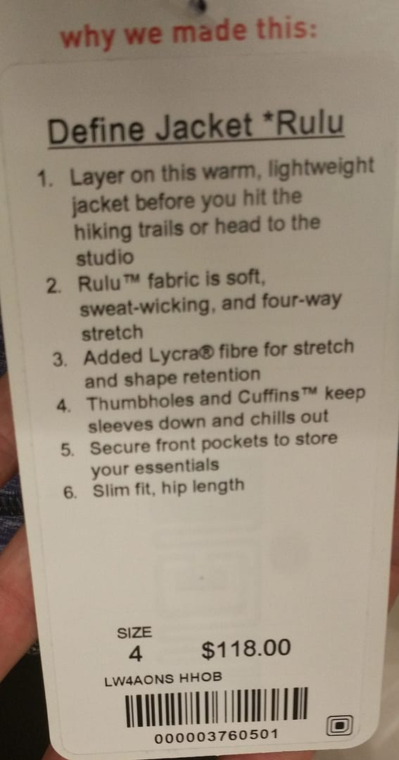 I thought I was the only one that was thinking the rulu define seems longer! I had to purchase a different define just to check if I was being delusional lol. I thought it would be warm until I tried going outside my backyard (it was only 5 degrees so not bad) and I can feel the breeze. Definitely disappointed in that department! It is very soft and comfy but it seems to emphasize my food baby more than the normal define jacket.