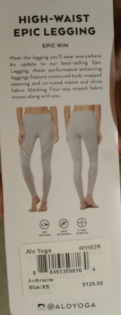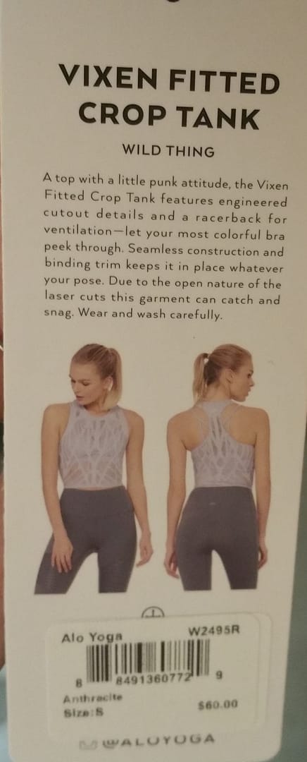 I liked the mesh detailing on these tights and the color (antracite — a steel gray). But I’m not sure I liked the placing of the stripes. I think it widened me a little. I really like this crop tank. The material is similar to Lululemon’s Reveal Crop/Crop Top fabric. I ended up getting the tank in black with another legging. The Vixen Fitted Crop Tank only comes in S, M and L so I got the S. The waistband hits right where the tight ends so there wasn’t much overlap. Alo does have a longer tank and an LS. I will definitely be weaking this crop tank during my spin classes!