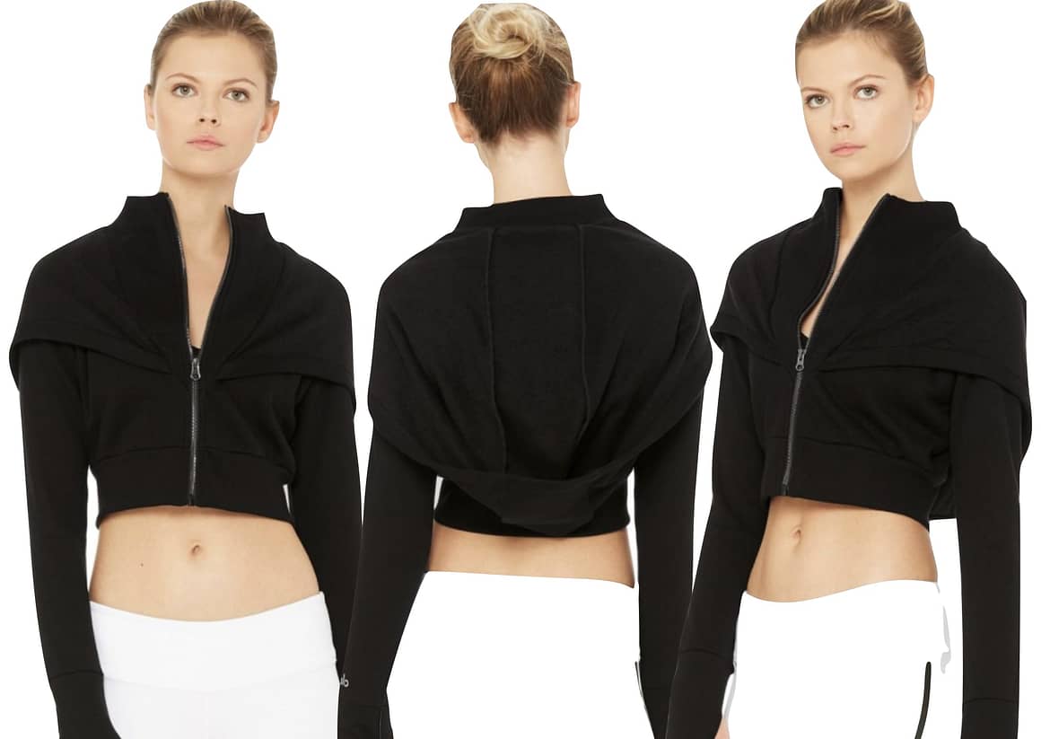 This is a cool wide-hooded cropped jacket. This jacket is TTS but I sized up so I could have a bit more length. With the hood down, it added a nice detail to the front of the jacket because it draped across the shoulders. I believe it was made from modal. Alo’s modal is very high quality. This jacket was buttery soft and draped well. It was really cute with the hood up as well. It definitely covered everything and didn’t fall over my eyes. The hood stayed put, which was great. Sometimes I find that Lululemon’s large hoods fall forward covering my eyes and if I pull it back a bit, it falls down. I wasn’t ready to spend $98 on this jacket, especially because there was another sweatshirt I liked better. But I’m going to think about it and if it’s still on my mind, I’ll order it online.
