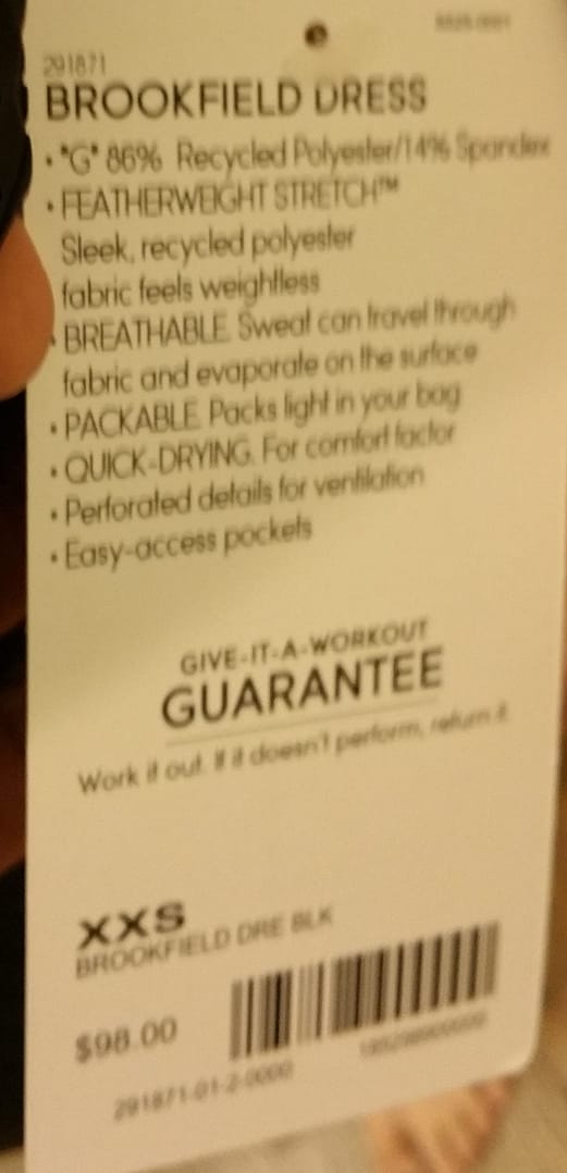I first tried this dress on in a size XS and the sales associate thought it looked too big on me.  Because the lightweight fabric didn’t have “weight” like the modal, this dress didn’t follow my silhouette as much as the size down.  So, in the pictures, I’m wearing a size XXS, which would be the size I would get.  This dress is made from recycled poly and is perforated for ventilation.  This would be a great dress for hot summer days.  I would probably get it in a bright color rather than in black but the store didn’t have an XXS in any other color.  This dress hit slightly above my knee.  Between the two, I think the Santorini Dress is cut better for me but I really liked the lightweight fabric of the Brookfield Dress.  If you’re in between sizes, I’d recommend going a size down.  However, a size down might be a problem for fuller cup sizes.