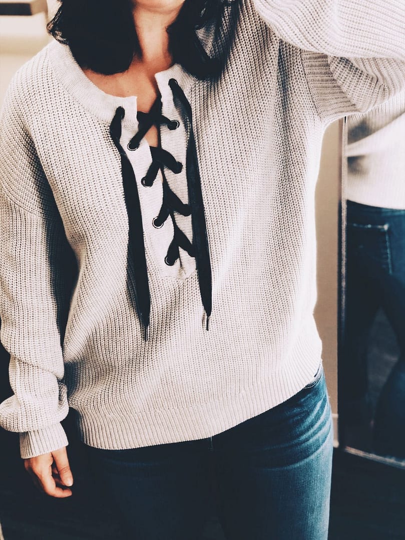 This Rails Sweater is my favorite sweater I’ve tried on from this sale. It’s exactly my style and I adore the velvet lace-up neckline. I’m still dreaming about the beauty of this sweater but ultimately I didn’t buy it because I felt it was on the pricey side even on sale considering it was made of an acrylic cotton blend. It’s very soft and because it’s acrylic it will probably wash very well, but I just wish it had been made from merino or cashmere at that price point. I just couldn’t bite the bullet on it but I really do love it.