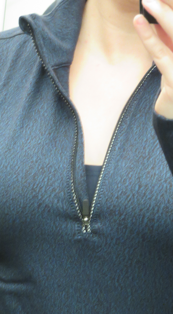 I really liked this pullover a lot and am considering ordering it tonight. The color is really pretty and much brighter than the LS I showed above. I like the looser fit and the softness of this jacquard material over the new version of rulu. An interesting thing I noticed is that the 1/2 zip zipper is curved. Are all 1/2 zips like that these days? I think it makes it much easier to pull the zipper up or down when you are one handed.