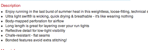Well I had the impulse decision today to return the Run: Weightless Singlet I got the other day. I really do love this tank for a lot of reasons but in the end, I was about to take the tags off to wear it out for a run and I decided that I didn’t love that the top panel of fabric in the back (where all the pretty laser cut design is) was not stretchy enough for running. The size up in a 10 was too large and billowy on me and caused puckering at the upper bust and the size 8 looked pretty and not too baggy in the tummy but the lack of stretch in the stiffer part of the fabric was going to be even more irritating once I actually used it for running with constant arm motion.