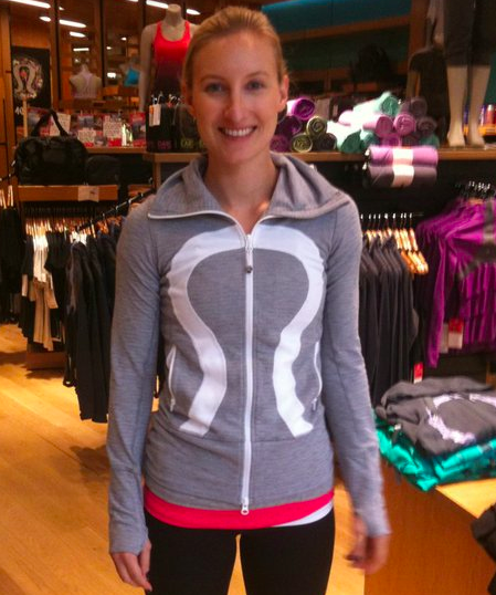 Thanks to a reader who pointed these out to me we now have some images of the newest Light Grey Pique In Stride Jacket as well as the Black/ Concord Grape Ikat No Limit Tank. I know feel like I need to try on this In Stride before I decide if I love it or not as I’m unsure if I like the white contrast zipper. The loveliness of Pique may prevail despite the white zipper though.
